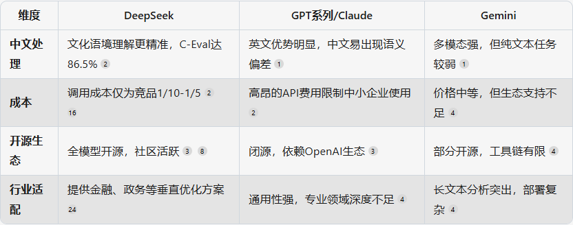 DeepSeek在中文任务(如C-Eval 86.5%、C-SimpleQA 64.1%)中表现优于GPT系列,尤其在文化背景理解和方言处理上更贴近本土用户需求。