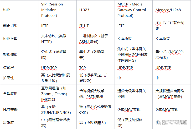 o 部署规模:SIP适合中小规模企业通信;MGCP/Megaco用于运营商级大规模接入(如PSTN与IP网互通)。