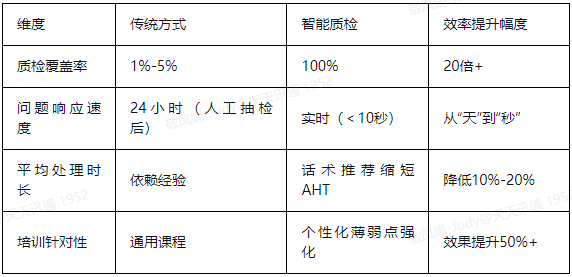 传统人工质检仅能覆盖1%-5%的对话,智能质检可分析100%的录音或文本,效率提升20倍以上。