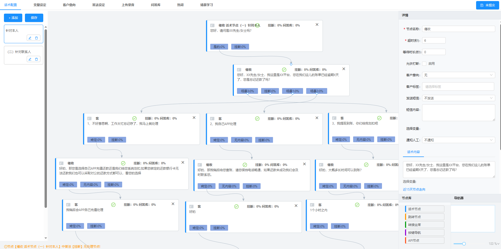 话术示例 1:“您好,XX 先生,我是 XX 公司催收专员。再次联系您是关于您尾号 XXXX 的贷款,目前已逾期 45 天,累计应还金额 5600 元,其中包含违约金 300 元。想和您同步下,逾期超过 30 天已经会影响您的征信记录了,咱们今天能沟通下还款方案吗?”