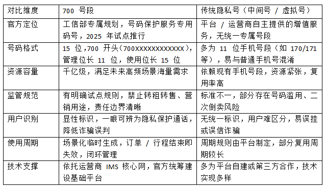 关系定位:700 号段是隐私号的标准化升级形态,试点过渡期后,号码保护业务将逐步统一使用 700 号段,替代此前杂乱的传统隐私号方案。